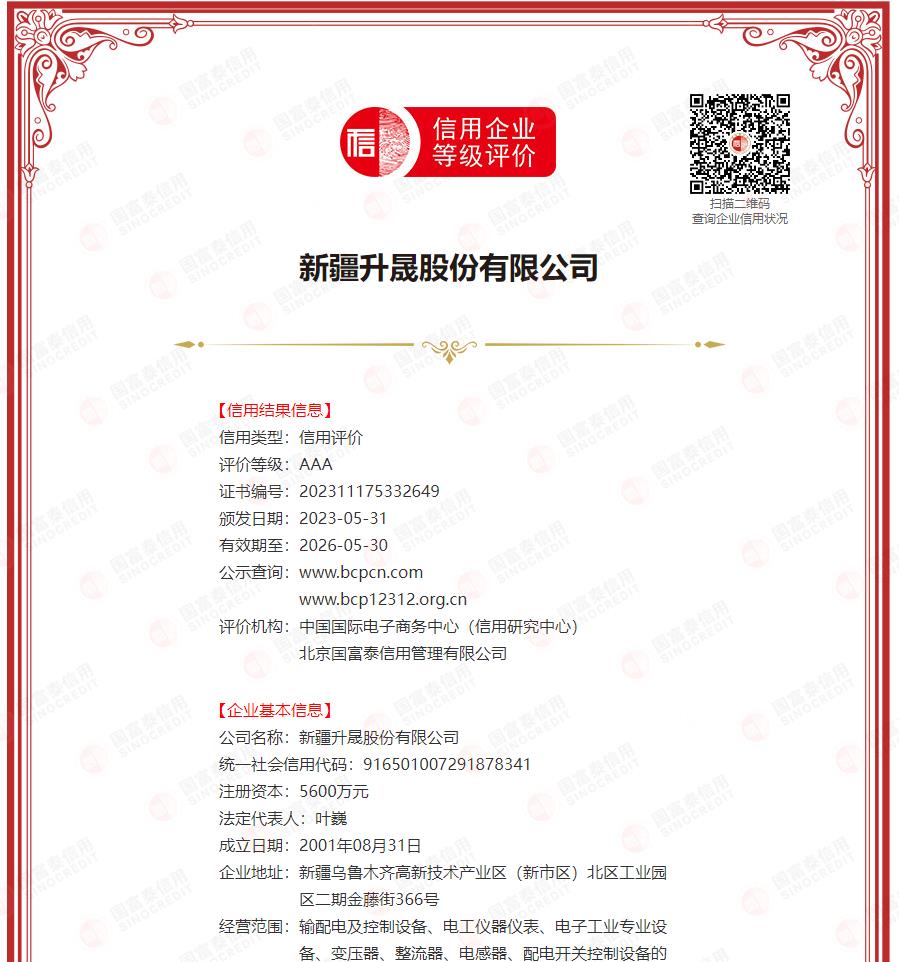 新疆升晟股份有限公司(以下简称升晟公司)成立于1970年,是乌鲁木齐市国有资产监督管理委员会下属的唯一一家国有独资工业企业。公司前身是乌鲁木齐变压器厂,具有40余年的变压器生产历史。新厂区位于高新区(新市区)北区工业园区二期金藤街366号,一期占地面积约12.14万平方米,注册资金5600万元,高新技术企业,乌鲁木齐市创新型企业,自治区认定的技术中心。主要产品:电力变压器、特种变压器、电焊机等。其中变压器为公司的主导产品,包括配电变压器、油井调容变压器、电炉变压器、整流变压器、电力变压器等产品,电压等级为330kV级及以下,单台容量为240000kVA及以下。变压器生产能力为500万kVA/年。我公司生产的H系列电炉变压器获得节能产品认定证书,且荣获自治区名牌产品称号。
