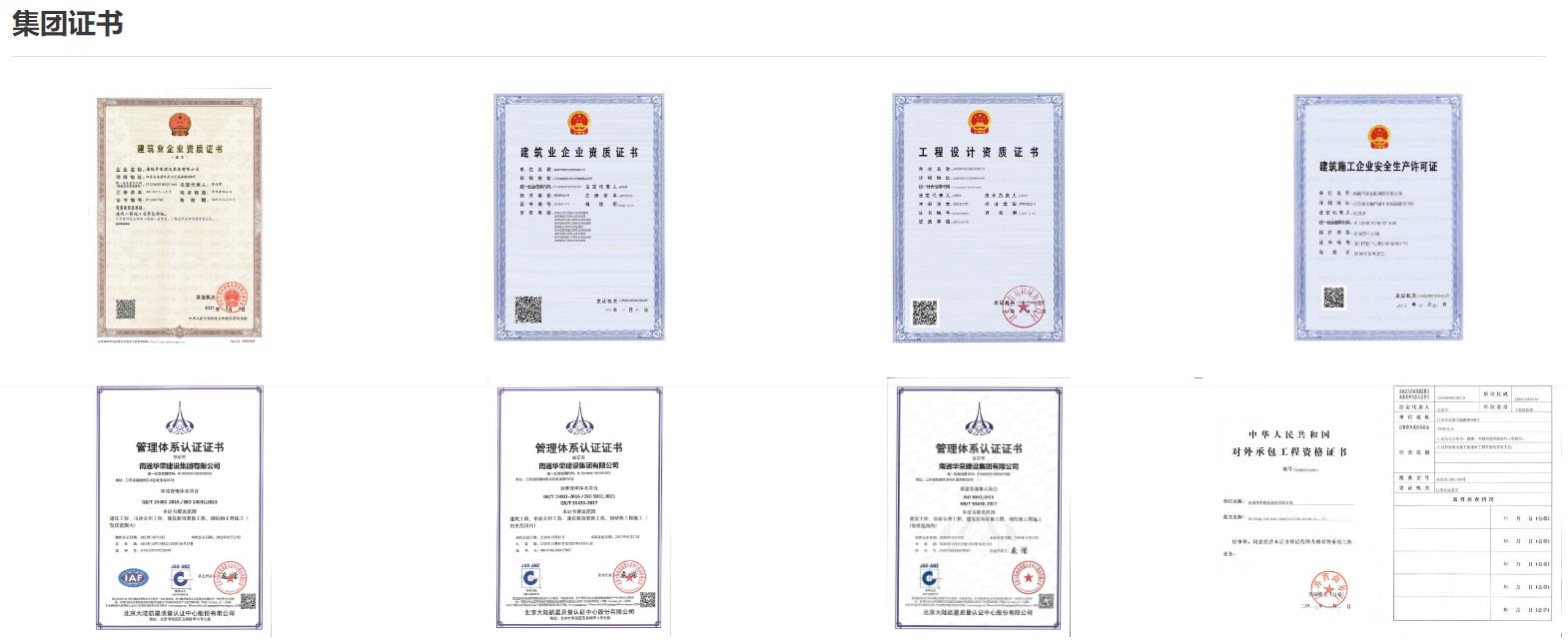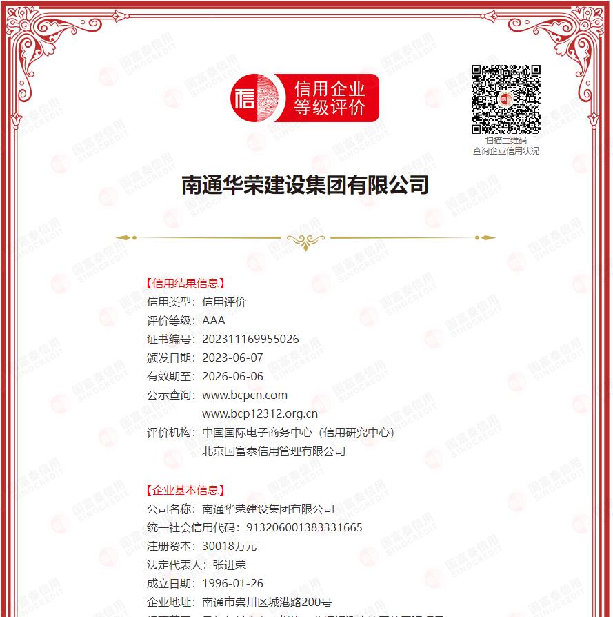 南通华荣建设集团有限公司创立于1996年,注册资本30018万元,年完成施工产值近150亿元。现有建筑工程施工总承包特级资质;市政公用工程施工总承包壹级资质;钢结构工程、建筑机电安装工程、建筑装饰装修工程、消防设施工程和地基基础工程专业承包壹级资质;建筑幕墙工程、电子与智能化工程和防水防腐保温工程专业承包贰级资质;同时具有工程设计建筑行业甲级资质及承包境外工程签约权;通过了质量、环境、职业健康安全三体系和两化融合管理体系认证。是集施工、研发、投资于一体的跨行业、跨区域、多元化发展的建筑企业集团。