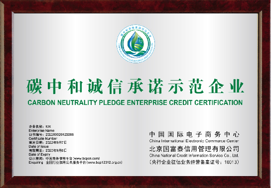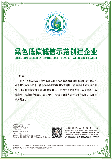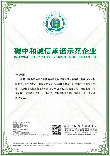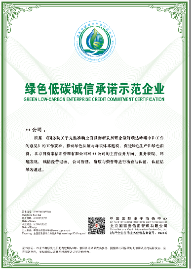 绿色低碳企业信用认证: 第三方信用服务机构对市场主体所做的绿色低碳工作,结合其经营发展、环境管理、资质荣誉、社会表现等内容进行征信核验后,出具的绿色低碳诚信证明。 认证标准:企业认证满分为100分,不设等级,评审分数≥60分,即为通过。 1、绿色低碳诚信承诺示范企业: