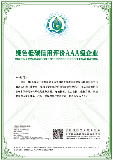 绿色低碳信用评价AAA级信用企业: 依据国内外双碳相关政策及法律法规,立足市场主体所处行业绿色低碳发展特点,在对其进行全面了解和分析的基础上,采用独有的绿色低碳征信评价方法,从业务发展、环境管理、社会责任、公司治理、资质荣誉等方面,对其绿色低碳信用状况做出的科学、客观的评审,并以通用的符号进行表示信用等级,向社会公示结果。 绿色低碳信用等级分为AAA、AA、A、B、C级。 1、服务内容—牌匾证书: