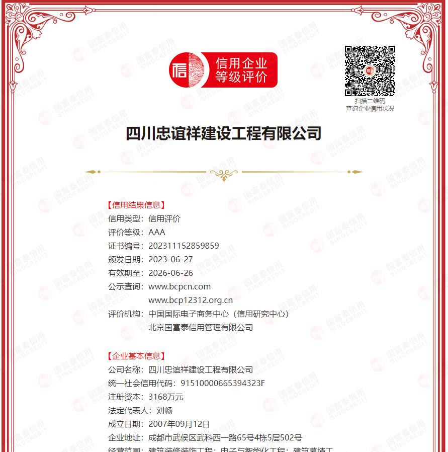 四川忠谊祥建设工程有限公司成立于2007年9月,注册资金3168万元。目前公司具有建筑工程施工总承包贰级、通信工程施工总承包叁级、电子与智能化工程专业承包壹级、建筑装修装饰工程专业承包壹级、建筑机电安装工程专业承包壹级、建筑幕墙工程专业承包壹级、输变电工程专业承包贰级、钢结构工程专业承包叁级等。公司经营范围涉及建筑装修装饰工程、电子与智能化工程、建筑幕墙工程、建筑机电安装工程、钢结构工程、输变电工程、通信工程、建筑工程、工程设计、租赁业、商务服务业、软件和信息技术服务业、人力资源服务、广告业、商品批发与零售等。 在通信、金融、教育、医疗、电力、酒店、商业、园林、家居、广告等领域设计和承建了很多精品工程,得到了建设单位及相关主管部门的认可和嘉奖。在成都、重庆、南充、遂宁、泸州、广元、广安、绵阳、达州、巴中、汉中、西安、郑州、昆明等地拓展了很多业务,并在部分地市设立了分公司或办事处,赢得了社会各界的好评和推崇。