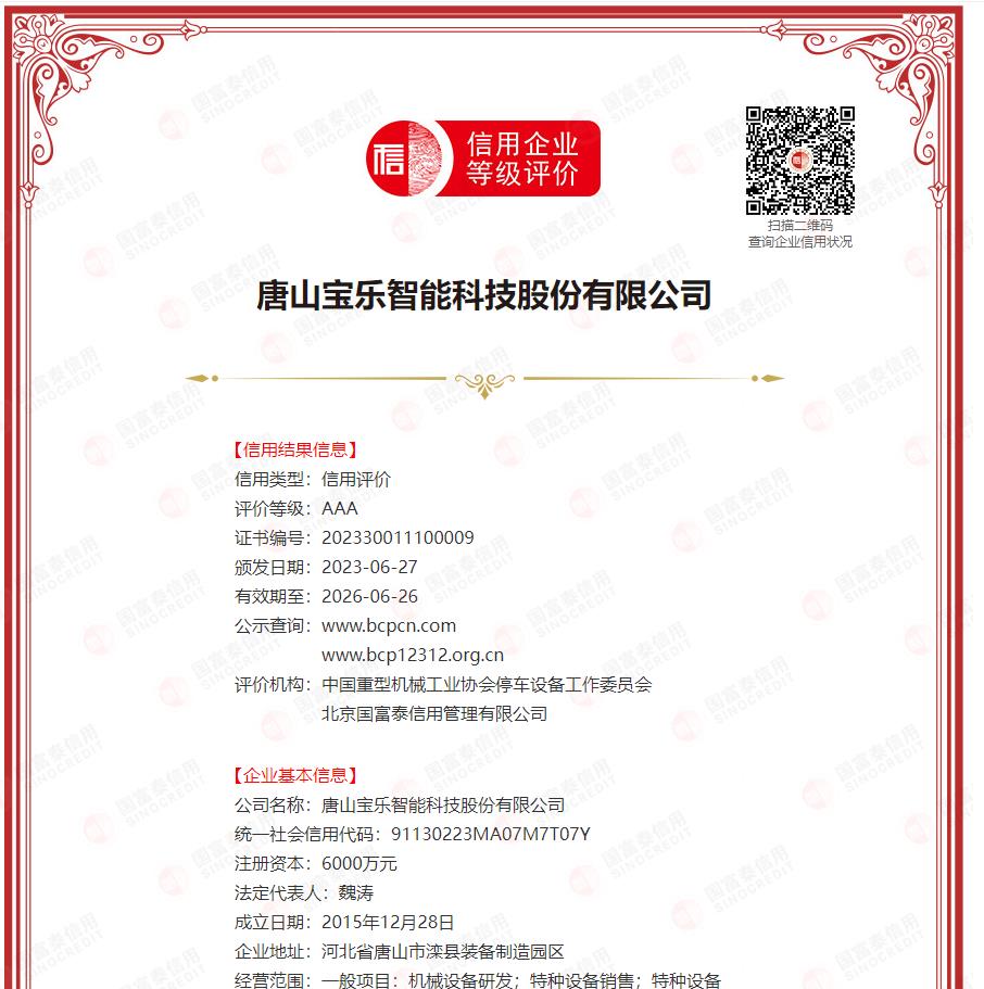 唐山宝乐智能科技股份有限公司成立于2015年12月,是专业研发制造机械式立体停车设备的高新技术企业;公司已取得国家质量技术监督检验总局批准的A级特种设备生产制造许可证及安装、改造、维修许可证。 公司集研发、设计、制造、安装、调试、销售、售后服务于一体,专注中国智能停车行业的研发生产和运营,自行开发了具有自主知识产权的高新技术设备,在前沿技术开发上,率先推广智能停车产业化模式。生产过程中自主研发智能控制系统,吸收消化国际先进技术,实现智能清洁生产。并凭借好技术和强大的生产能力,为国内立体停车设备市场的发展注入了强大的推动力。 公司拥有工程技术人员100余人,员工总人数达400余人,同时拥有一支70余名的技术研发团队和拥有熟练安装经验的高素质的专业安装服务团队。 公司具有雄厚的加工制造实力,尤其在大型钢构件制造、焊接、表面处理等领域有独特的优势。现已具备年产30万车位的生产能力,其规模和加工水平居同行业地位。 公司主要产品有:垂直循环类、升降横移类、垂直升降类、简易升降类、多层循环类、平面移动类、巷道堆垛类、及汽车专用升降机等系列机械式立体停车设备。设备智能操作、外形美观,具有空间利用率高、安装方便、能耗低、噪音小等特点,适用于各种场所。 未来,我们将提高驾驶者的停车效率,提升停车场的使用效率,改善城市交通状况,解决国家停车难的民生问题。以开发高性能、高品质、更具人性化的产品为宗旨,让更多的终端消费者使用宝乐智能停车产品,享受宝乐智能停车系统提供的专业服务,让宝乐智能科技成为名符其实的“中国静态交通解决专家”。