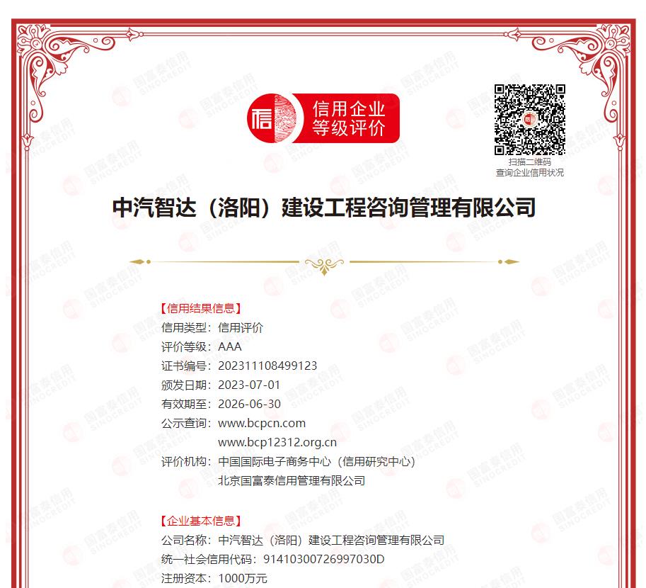 中汽智达(洛阳)建设工程咨询管理有限公司成立于1993年,中国汽车工业工程有限公司下属国有全资建设监理企业,注册地河南省洛阳市涧西区,注册资金1000万元。持有国家住房和城乡建设部颁发的建设监理行业高资质—综合监理资质证书(证书号:E141009144)。主营业务:工程监理、工程总承包、项目管理,兼营:地质勘察、地基处理、技术咨询、造价咨询、工程设计、环境影响评价等。