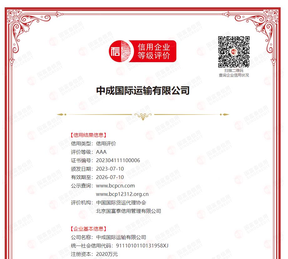 祝贺中成国际运输有限公司荣获国富泰信用AAA级信用企业荣誉国家级企业AAA信用评价中心![]() 中成国际运输有限公司 COMTRANS